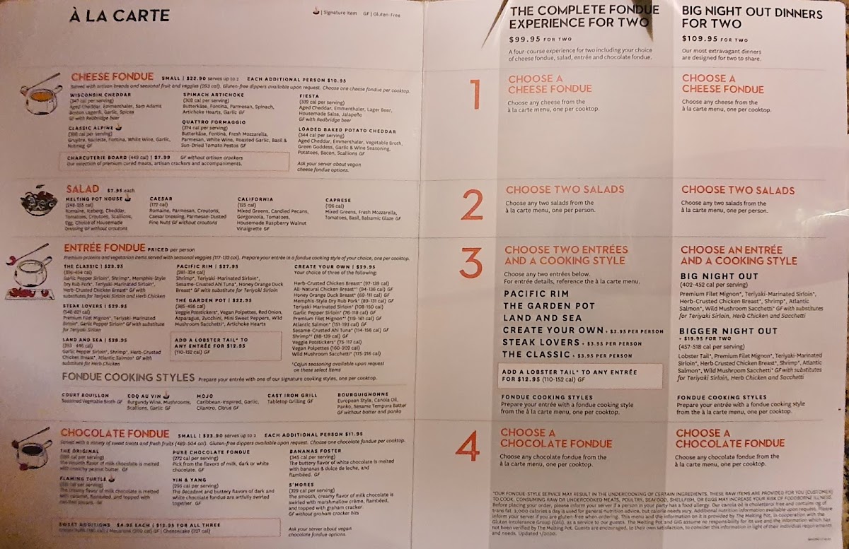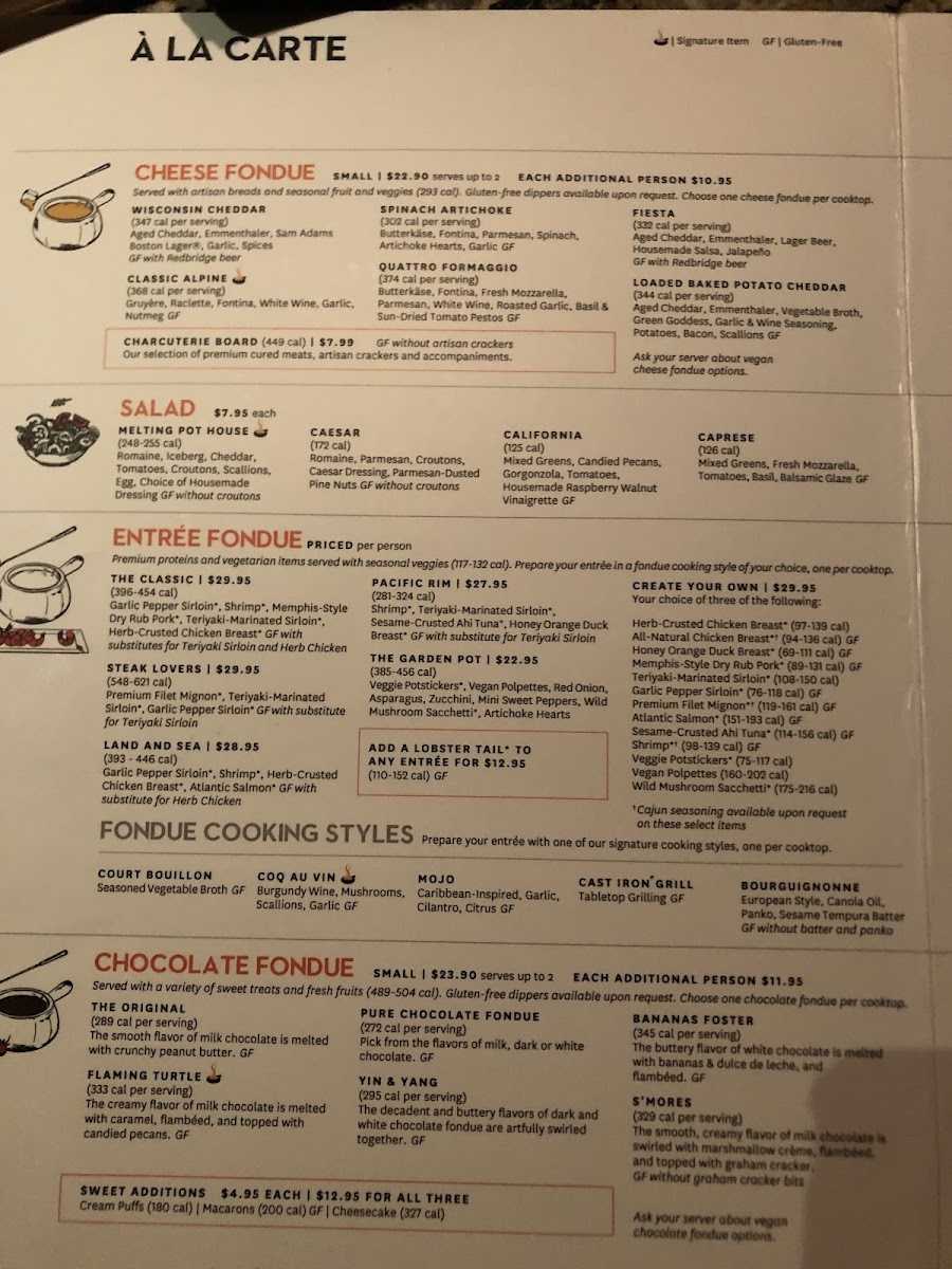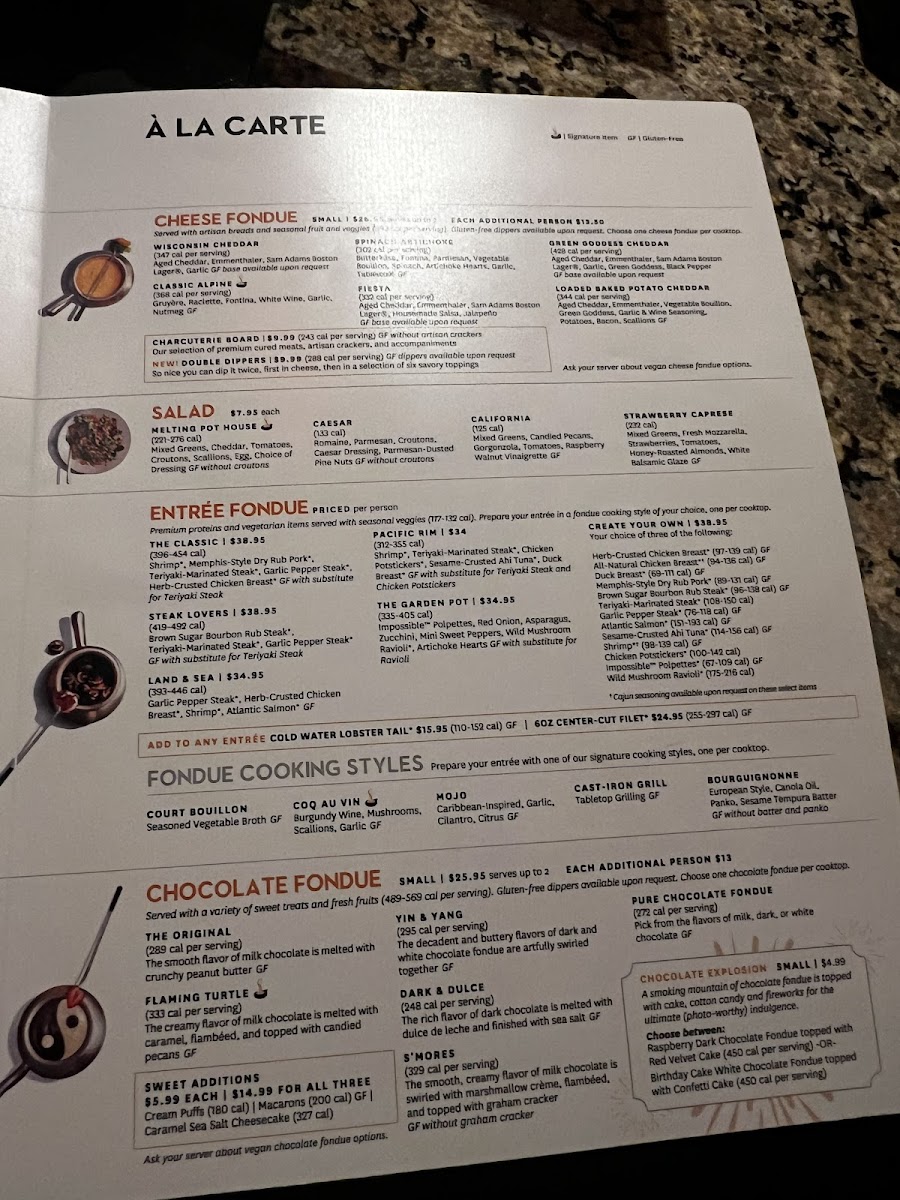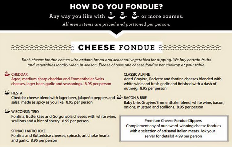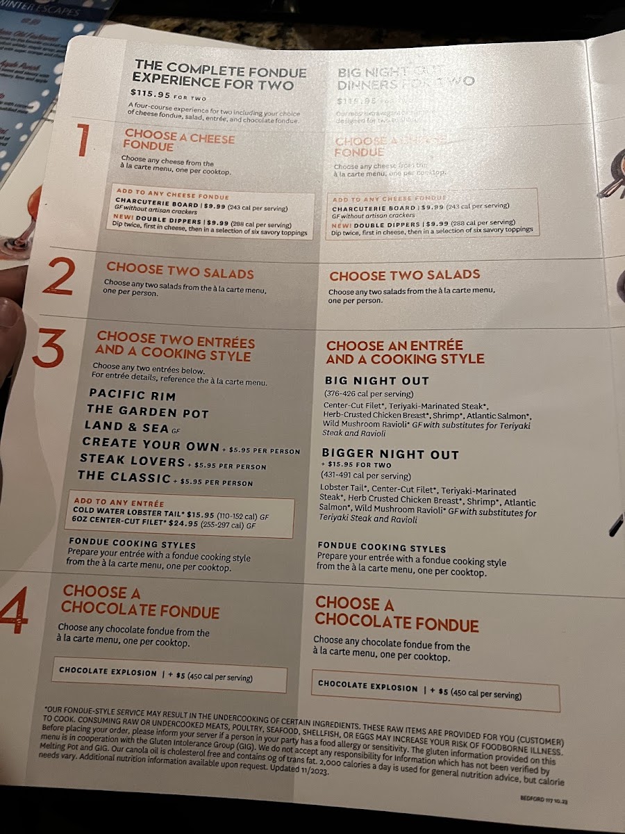 ................................US$115.95A four-course experience for two including your choice of cheese fondue, salad, entrée and chocolate fondue. Entrée options are listed in Step 3: Entrée & Cooking Style
