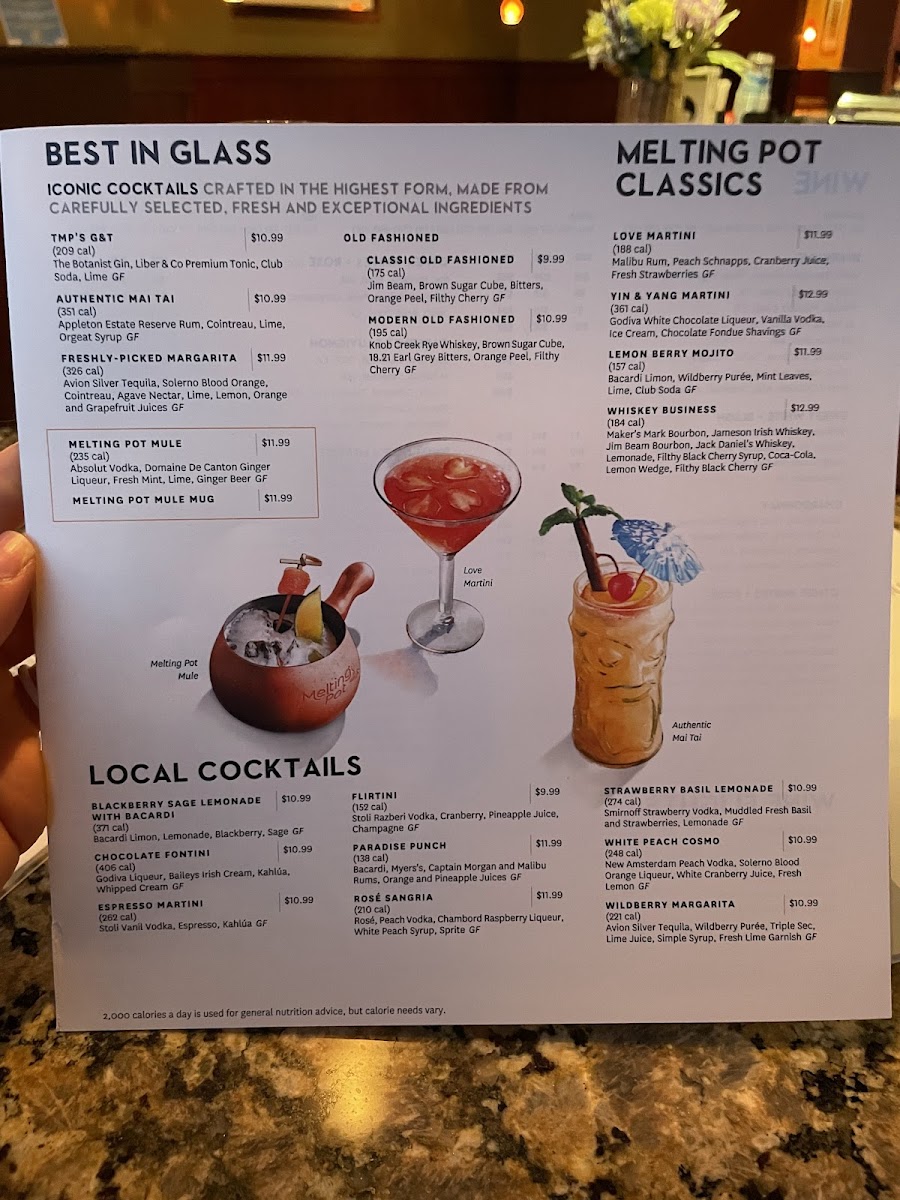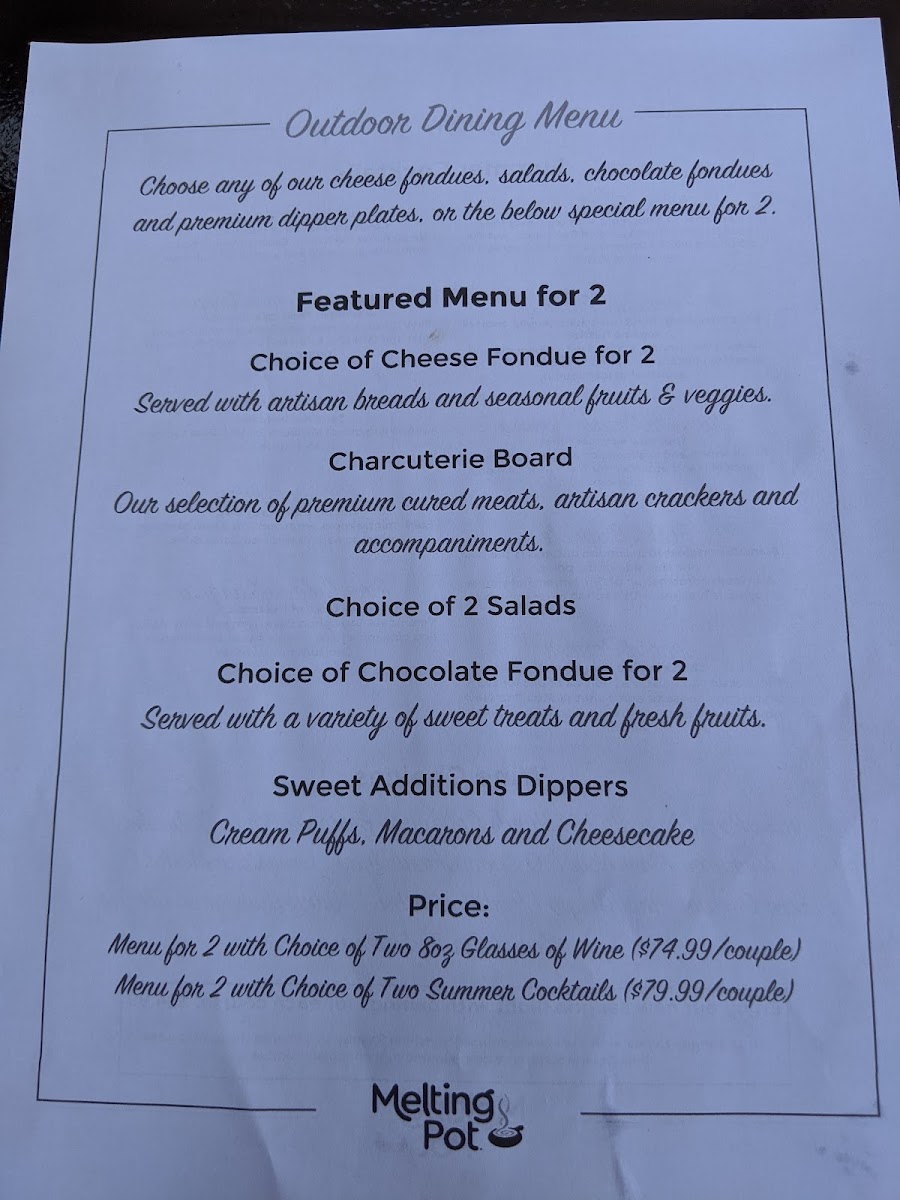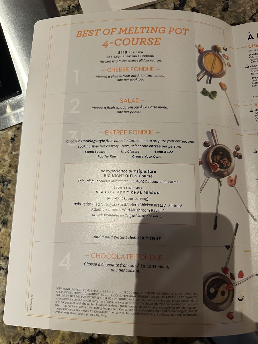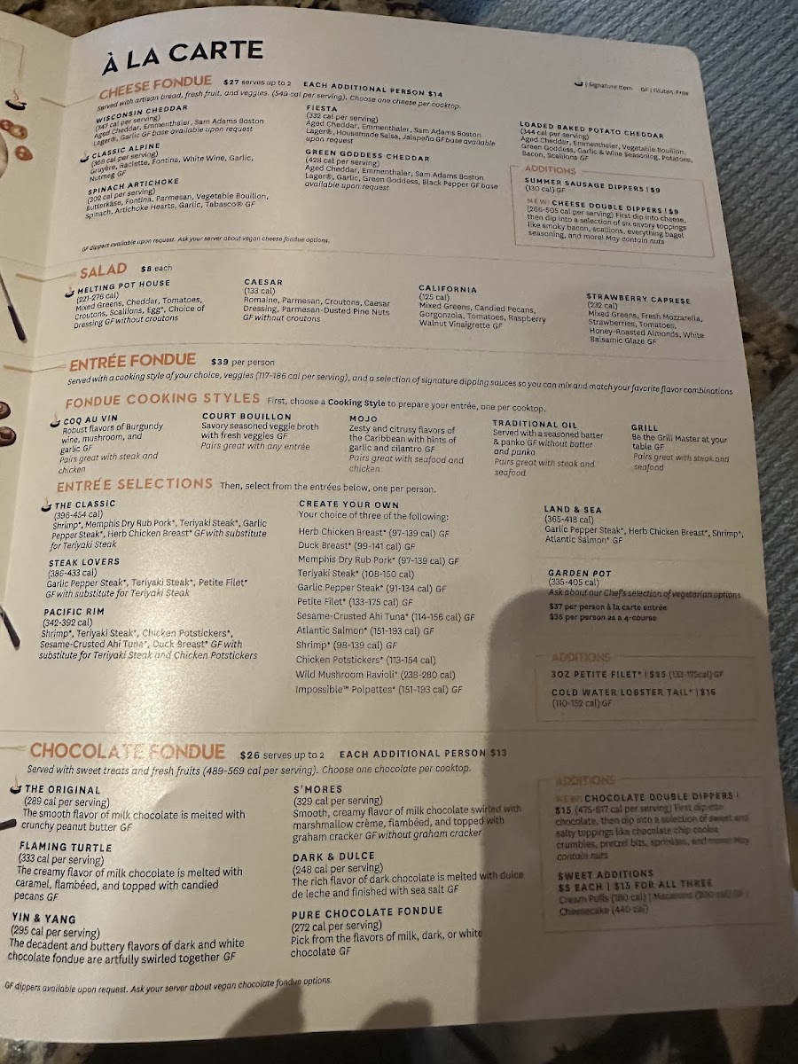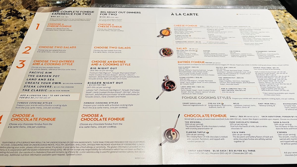 ................................US$115.95A four-course experience for two including your choice of cheese fondue, salad, entrée and chocolate fondue. Entrée options are listed in Step 3: Entrée & Cooking Style
